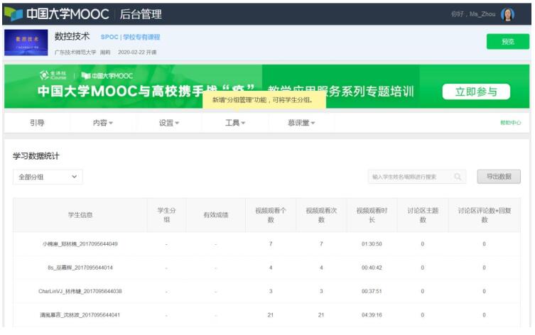 周莉教授通过中国大学mooc异步SPOC查看员工的在线视频观看时长