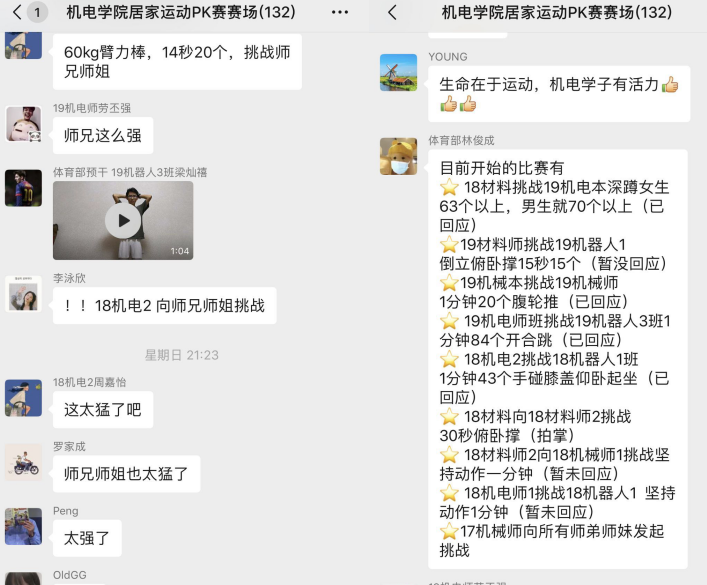 为进一步保障学子们的身心健康,球速体育还发起了“阳光健康宅,线上动起来”线上运动打卡活动和班级挑战赛,全院除毕业班外所有班级均报名参加,活动备受机电员工欢迎,取得良好活动效果。活动每一期分为主题健身打卡个人赛和PK挑战班级赛,个人和集体进行了完美融合。主题健身打卡个人赛要求参赛员工每日围绕一个既定主题,比如一分钟开合跳、八段锦指定式等,进行居家运动打卡并录制好视频上交,公司员工会体育部审核后每日在年级群公布个人赛排名情况。班级挑战赛将任意两个班级分为攻守方,攻方录制居家运动挑战视频通过PK赛微信群发布挑战,守方需要限时进行回应,根据比拼情况最终确定赛事结果。自开展线上运动打卡活动以来,同学们踊跃报名参加,在“云”端各显身手,60KG臂力棒14秒20个、1分钟84个开合跳、1分钟43个手碰膝盖仰卧起坐、1分钟20个腹轮推……各方选手表现精彩纷呈,公司领导和老师们也积极参与其中与学子们一起互动分享,畅聊居家体育运动,鼓励同学们宅家学习之余加强身体锻炼,保持身心健康。