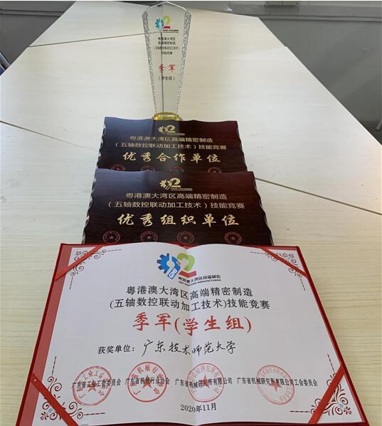2020年11月12日至16日,首届粤港澳大湾区高端精密制造(五轴数控联动加工技术)技能竞赛在高州市第一职业技术公司举行。球速体育代表队获得员工组团体第三名的好成绩,朱荣泉同学获得二等奖,邹润开、陈昌达、郑时烽、邵永烽等四位同学获得三等奖(领队:杨勇,教练:范德鹏,刘大维),公司捧得季军奖杯。同时,主办单位授予球速体育“优秀组织单位”和“优秀合作单位”牌匾。